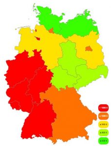 Beim Vergleich der Gesamtkosten für eine Zahnarztbehandlung in Deutschland fällt auf, dass es ein Süd-Nord-Gefälle gibt. In Mecklenburg-Vorpommern und Schleswig-Holstein sind die Kosten mit bis zu 650 EUR pro Behandlung sehr günstig. Patienten, die in Hesse, Rheinland-Pfalz, im Saarland, in NRW und in Baden-Württemberg leben, zahlen hingegen im Durchschnitt mehr als 1.000 EUR für eine Zahnbehandlung. Im Mittelfeld liegen Thüringen, Sachsen und Sachsen-Anhalt mit Kosten von bis zu 1.000 EUR pro Behandlung. In Brandenburg und Niedersachsen kostet eine Behandlung durchschnittlich 900 EUR. Hamburg, Bremen und Berlin sind mit etwa 1.000 EUR ebenfalls recht teuer.